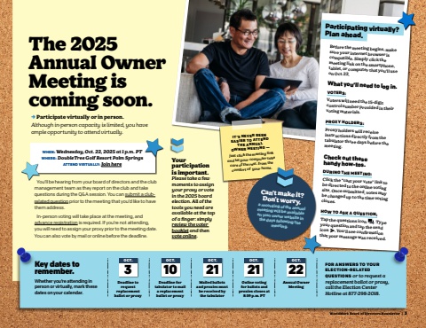 WorldMark Board of Directors Newsletter | 3Key dates to remember.Whether you%u2019re attending in person or virtually, mark these dates on your calendar.FOR ANSWERS TO YOUR ELECTION-RELATED QUESTIONS or to request a replacement ballot or proxy, call the Election Center Hotline at 877-298-2018.Deadline to request replacement ballot or proxy10OCT.Deadline for tabulator to mail a replacement ballot or proxy21OCT.Mailed ballots and proxies must be received by the tabulatorOnline voting for ballots and proxies closes at 8:59 p.m. PTAnnual Owner Meeting3OCT.21OCT.22OCT.The 2025 Annual Owner Meeting is coming soon.V Participate virtually or in person.Although in-person capacity is limited, you have ample opportunity to attend virtually.WHEN: Wednesday,Oct. 22, 2025 at 1 p.m. PTWHERE: DoubleTree Golf Resort Palm SpringsATTEND VIRTUALLY: Join hereYou%u2019ll be hearing from your board of directors and the club management team as they report on the club and take questions during the Q&A session. You can submit a clubrelated question prior to the meeting that you%u2019d like to have them address.In-person voting will take place at the meeting, and advance registration is required. If you%u2019re not attending, you will need to assign your proxy prior to the meeting date. You can also vote by mail or online before the deadline.Your participation is important.Please take a few moments to assign your proxy or vote in the 2025 board election. All of the tools you need are available at the tap of a finger: simply review the voter booklet and then vote online.IT%u2019S NEVER BEEN EASIER TO ATTEND THE ANNUAL OWNER MEETING %u2014 just click the meeting link and let your computer take care of the rest. from the comfort of your home.Before the meeting begins, make sure your internet browser is compatible. Simply click the meeting link on the smartphone, tablet, or computer that you%u2019ll use on Oct.22. Can%u2019t make it? Don%u2019t worry, a recording of the annual meeting will be available on your owner website in the days following the meeting. What you%u2019ll need to log in.VOTERS:Voters will need the 15-digit control number provided in their voting materials. PROXY HOLDERS:Proxy holders will receive instructions directly from the tabulator three days before the meeting. Check out these handy how-tos.DURING THE MEETING:Click the %u201ccast your vote%u201d link to be directed to the online voting site. Once submitted, votes may be changed up to the time voting closes.HOW TO ASK A QUESTION:Tap the questions icon . Type your question and tap the send icon . You%u2019ll see confirmation that your message was received.Participating virtually? Plan ahead.