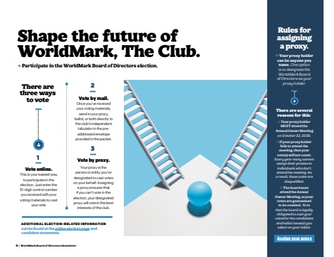 Shape the future of WorldMark, The Club. VParticipate in the WorldMark Board of Directors election. ADDITIONAL ELECTION-RELATED INFORMATION can be found at the online election page and candidate statements.Rules for assigning a proxy.V Your proxy holder can be anyone you name. One option is to designate the WorldMark Board of Directors as your proxy holder. There are several reasons for this: %u273d Your proxy holder MUST attend the Annual Owner Meetingon October 22, 2025.%u273d If your proxy holder fails to attend the meeting, then your vote(s) will not count. Every year many owners assign their proxies to individuals who don%u2019t attend the meeting. As a result, these votes are disqualified. %u273d %u2794 The board must attend the Annual Owner Meeting, so your votes are guaranteed to be counted. Note that the board is legally obligated to cast your votes for the candidates and ballot issue(s) you select on your ballot.Assign your proxy4 | WorldMark Board of Directors Newsletter There are three ways to voteVote online. This is your easiest way to participate in the election. Just enter the 15-digit control number you received with your voting materials to cast your voteVote by mail.Once you%u2019ve received your voting materials, send in your proxy, ballot, or both directly to the club%u2019s independent tabulator in the preaddressed envelope provided in the packet.Vote by proxy.Your proxy is the person or entity you%u2019ve designated to cast votes on your behalf. Assigning a proxy ensures that if you can%u2019t vote in the election, your designated proxy will vote in the best interests of the club.123