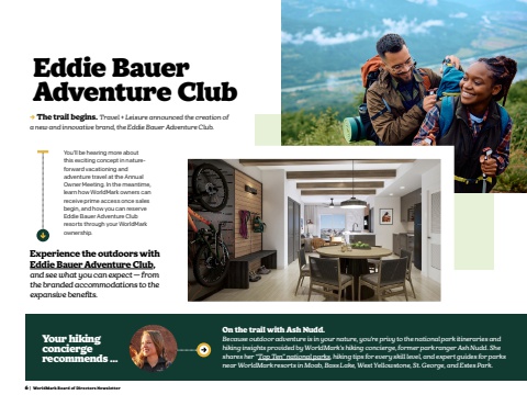 6 | WorldMark Board of Directors Newsletter Eddie Bauer Adventure ClubVThe trail begins. Travel + Leisure announced the creation of a new and innovative brand, the Eddie Bauer Adventure Club. You%u2019ll be hearing more about this exciting concept in natureforward vacationing and adventure travel at the Annual Owner Meeting. In the meantime, learn how WorldMark owners can receive prime access once sales begin, and how you can reserve Eddie Bauer Adventure Club resorts through your WorldMark ownership.AVAILABILITY IS LIMITED and WorldMark benefits are not recognized at these resorts, but you%u2019ll still receive complimentary Wi-Fi and high-quality service from Club Wyndham%u2019s on-site staff. Book online or call the planning center.LEARN MORE about these resorts.Experience the outdoors with Eddie Bauer Adventure Club, and see what you can expect %u2014 from the branded accommodations to the expansive benefits.On the trail with Ash Nudd.Because outdoor adventure is in your nature, you%u2019re privy to the national park itineraries and hiking insights provided by WorldMark%u2019s hiking concierge, former park ranger Ash Nudd. She shares her %u201cTop Ten%u201d national parks, hiking tips for every skill level, and expert guides for parks near WorldMark resorts in Moab, Bass Lake, West Yellowstone, St. George, and Estes Park. Your hiking concierge recommends %u2026