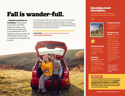 Fall is wander-full.Upcoming resort renovations.From the outside to the inside, these resorts are having some work done.%u273dWorldMark Pinetop will undergo paint renovations to the property through Oct. 31, 2025.%u273dWorldMark Solvang%u2019s pool area will be closed for remodeling purposes Jan. 1 - Feb. 28, 2026. Parking may be blocked for staging purposes. %u273dWorldMark Victoria will undergo interior renovations Jan. 6 - March 1, 2026. %u273d WorldMark Long Beach will undergo an interior and exterior renovation June 15 - Nov. 1, 2026. This project will result in portions of the parking lot being unavailable due to staging, as well as half the suites and half the common areas. One elevator will be dedicated to the project. During renovations, noise, dust, odors, and work crews may be experienced. Dates are subject to change.Go leaf-peeping in California or Oregon wine country. Drive through desert landscapes around Indio and Palm Springs, or along the Enchanted Circle of New Mexico. Meander through open-air markets and food stalls in your favorite cities. Enjoy uncrowded beaches and unhurried visits to theme parks in Florida.The Astoria-Megler Bridge will be under construction through Oct. 31, 2025 affecting access to WorldMark Seaside, WorldMark Long Beach, and WorldMark Surfside Inn. Bridge traffic will be reduced to a single lane in both directions. Please plan for travel delays if your route includes this bridge. PLAN AHEAD or jump on a last-minute getaway deal at worldmarkbywyndham.com.VDetours and drive-to vacations. It%u2019s the season to slow down, get off the Interstate, and stop at the small towns along the way to your destination. The air might feel crisp, but the warmth of this golden season brings contentment and relaxation like no other.SPECIAL ALERTWorldMark Board of Directors Newsletter | 7